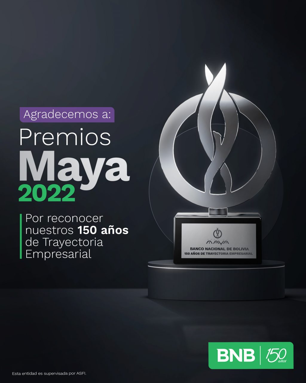 El Banco Nacional de Bolivia es elegido como ganador en la categoría 150 años de Trayectoria Empresarial, de los Premios Maya 2022. Es el sexto año consecutivo que la entidad bancaria es reconocida por los organizadores de la ceremonia que homenajea a las empresas comprometidas con el desarrollo del país.